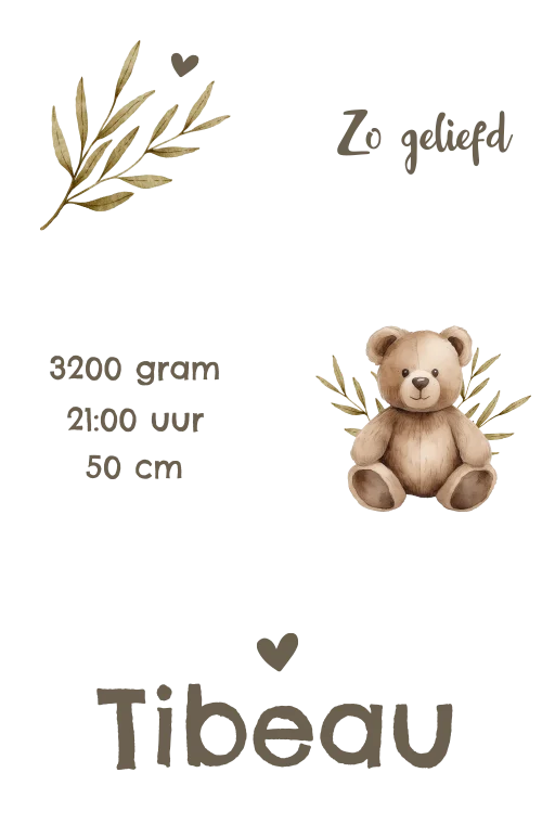 Dit is een lieve set van houten blokken. Op de blokken staat de illustraties van een lief teddybeertje, hartjes en blaadjes. Ook zijn op de blokken de geboortegegevens te zien. De blokken kunnen naar wens aangepast worden in onze online opmaaktool.