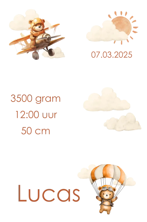 Dit is een avontuurlijke set van houten blokken. Op de blokken zijn een beertje in een vliegtuig, een zon met wolkje, de geboortegegevens en twee wokjes te zien. Op het grootste blok kan de naam van het kleintje gedrukt worden. De blokken kunnen naar wens aangepast worden in onze online opmaaktool.