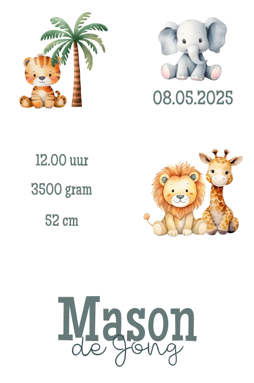 Dit is een avontuurlijke set van houten blokken. Op de blokken zijn een tijger, olifantje, de geboortegegevens en een leeuwtje met giraffe te zien. Op het grootste blok kan de naam van het kleintje gedrukt worden. De blokken kunnen naar wens aangepast worden in onze online opmaaktool.