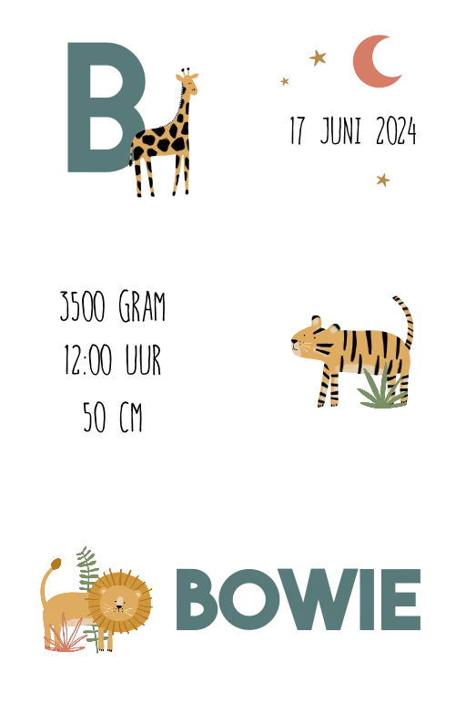 Dit is een stoere set van houten blokken. De blokken hebben een jungle thema. Ook zijn op de blokken de geboortegegevens van het kleintje te zien. De blokken kunnen naar wens aangepast worden in onze online opmaaktool.