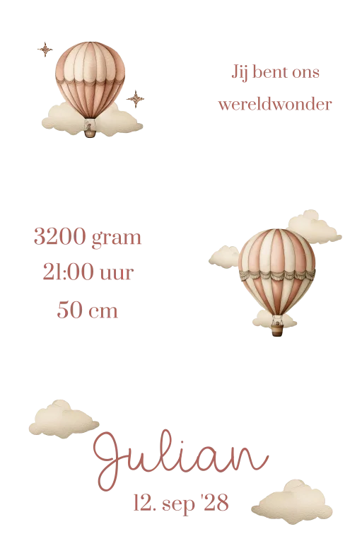 Dit is een lieve set van houten blokken. Op de blokken staan de illustraties van luchtballonnen en wolkjes. Ook zijn op de blokken de geboortegegevens te zien. De blokken kunnen naar wens aangepast worden in onze online opmaaktool.