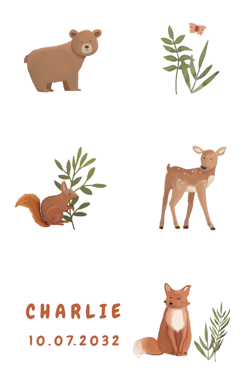 Dit is een avontuurlijke set van houten blokken. De blokken hebben een bosdieren thema. Op het grootste blok kan de naam van het kleintje en de geboortedatum gedrukt worden. De blokken kunnen naar wens aangepast worden in onze online opmaaktool.