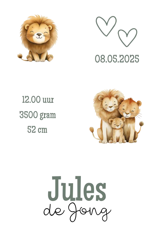 Dit is een avontuurlijke set van houten blokken. Op de blokken is een leeuwen gezin te zien en de geboortegegevens. Op het grootste blok kan de naam van het kleintje gedrukt worden. De blokken kunnen naar wens aangepast worden in onze online opmaaktool.