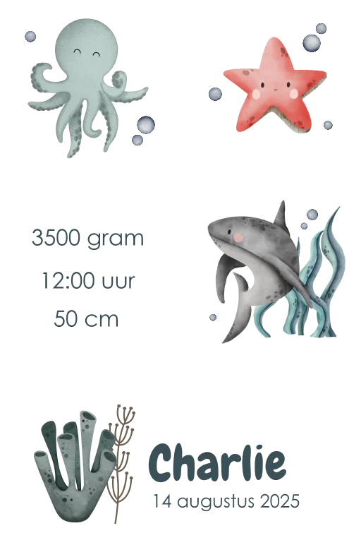 Dit is een avontuurlijke set van houten blokken. Op de blokken zijn een octopus, zeester, geboortegegevens en haai te zien. Op het grootste blok kan de naam van het kleintje en de geboortedatum gedrukt worden. De blokken kunnen naar wens aangepast worden in onze online opmaaktool.