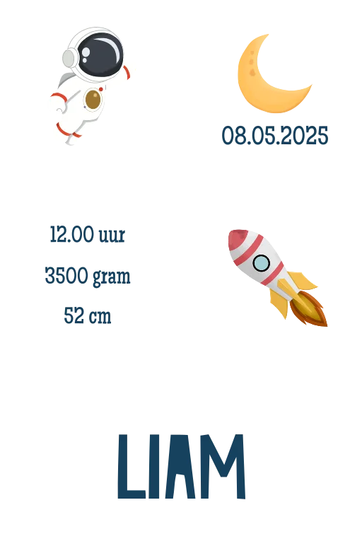 Dit is een avontuurlijke set van houten blokken. Op de blokken is een astronaut, raket en maan te zien en de geboortegegevens. Op het grootste blok kan de naam van het kleintje gedrukt worden. De blokken kunnen naar wens aangepast worden in onze online opmaaktool.