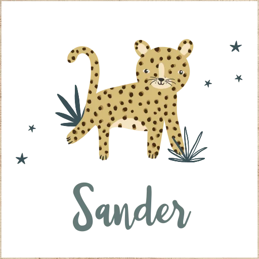 Deze houten spaarpot is leuk voor je eigen kleintje of om cadeau te doen. Op de spaarpot is de illustratie van een cheetah te zien. Daar omheen staan sterretjes en plantjes. Geef de spaarpot een persoonlijke touch door de naam van het kleintje erop te zetten. De spaarpot is helemaal naar wens aan te passen in onze online editor.
