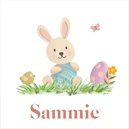 Een vrolijk slabbetje voor aan de paastafel. Dit slabbetje heeft een vrolijk ontwerp met een konijntje in het gras tussen de eieren. Onderaan lees je de naam van het kindje.