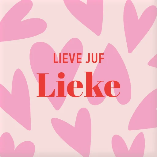 Een lief en hip tegeltje voor de juf! Een gepersonaliseerd cadeau om het jaar mee af te sluiten. Het tegeltje heeft een roze hartjes patroon. Daarop lees je de tekst 'Lieve Juf'.