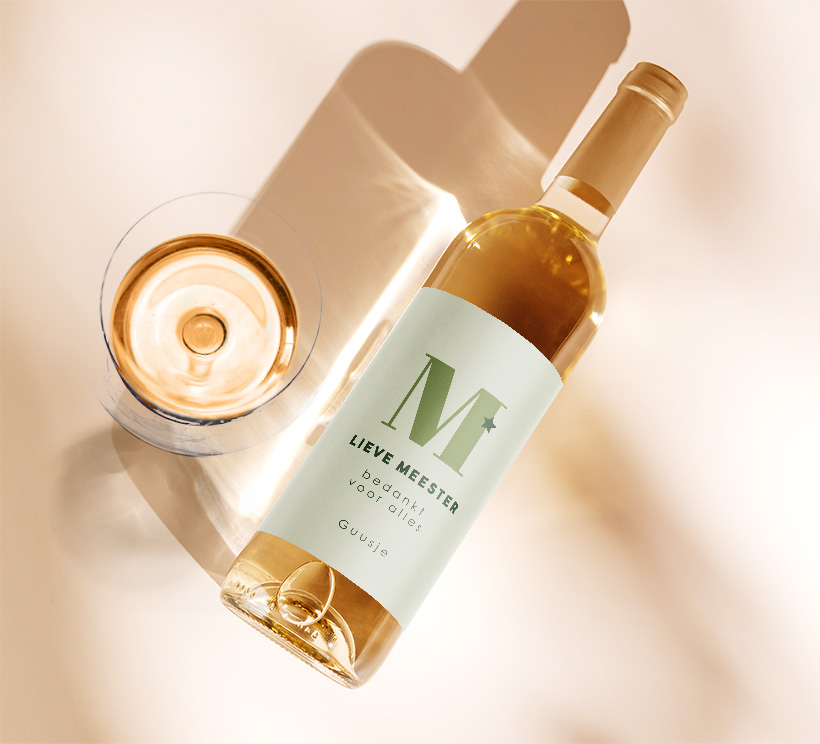 Meester bedankt cadeau voor het einde van het jaar. Deze groene wijnetiket kan je zelf gemakkelijk op een wijnfles plakken. Het etiket heeft een groot initiaal en ruimte voor een eigen tekst.
