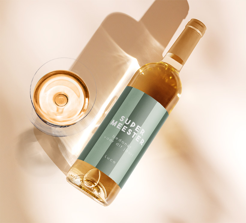 Een afscheidscadeautje voor de meester: een gepersonaliseerd wijnetiket. De sticker heeft een vrolijk ontwerp met groene strepen en een lieve zelf te kiezen tekst.
