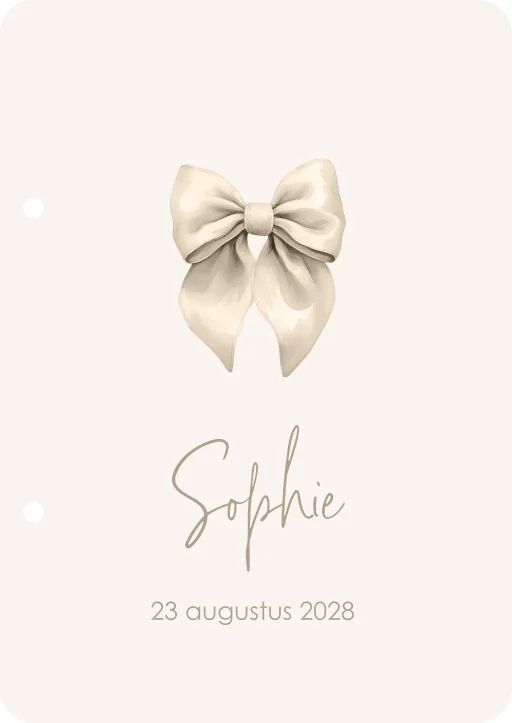 Wat een lieve houten bewaarbundel! Handig voor wenskaarten, geboortekaartjes of andere herinneringen die je graag wil bewaren. Op de bewaarbundel zie je een lieve illustratie van een beige strik.