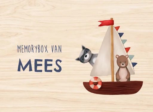 Hippe houten box als kraamcadeau of voor je eigen kindje. Deze houten memorybox is perfect voor spulletjes uit de zwangerschaps- en babytijd. Op de memorybox lees je de naam van het kindje en zie je een boot met dieren.