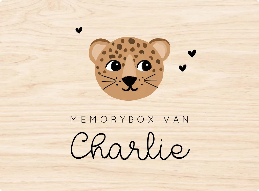 Geef deze mooie houten box als kraamcadeau of gebruik het voor je eigen kindje. Deze memorybox is perfect om spulletjes uit de zwangerschaps- en babytijd in te bewaren. Op de memorybox staat de illustratie van een panter met kleine hartjes. Maak de box extra persoonlijk door de naam van het kindje toe te voegen. De memorybox is naar wens aan te passen in onze online editor.