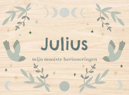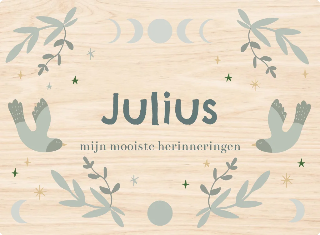 Hippe houten box als kraamcadeau of voor je eigen kindje. Deze houten memorybox is perfect voor spulletjes uit de zwangerschaps- en babytijd. Op deze memorybox zijn vogels, takjes en de naam van het kleintje te zien. Pas de memorybox eenvoudig zelf aan.
