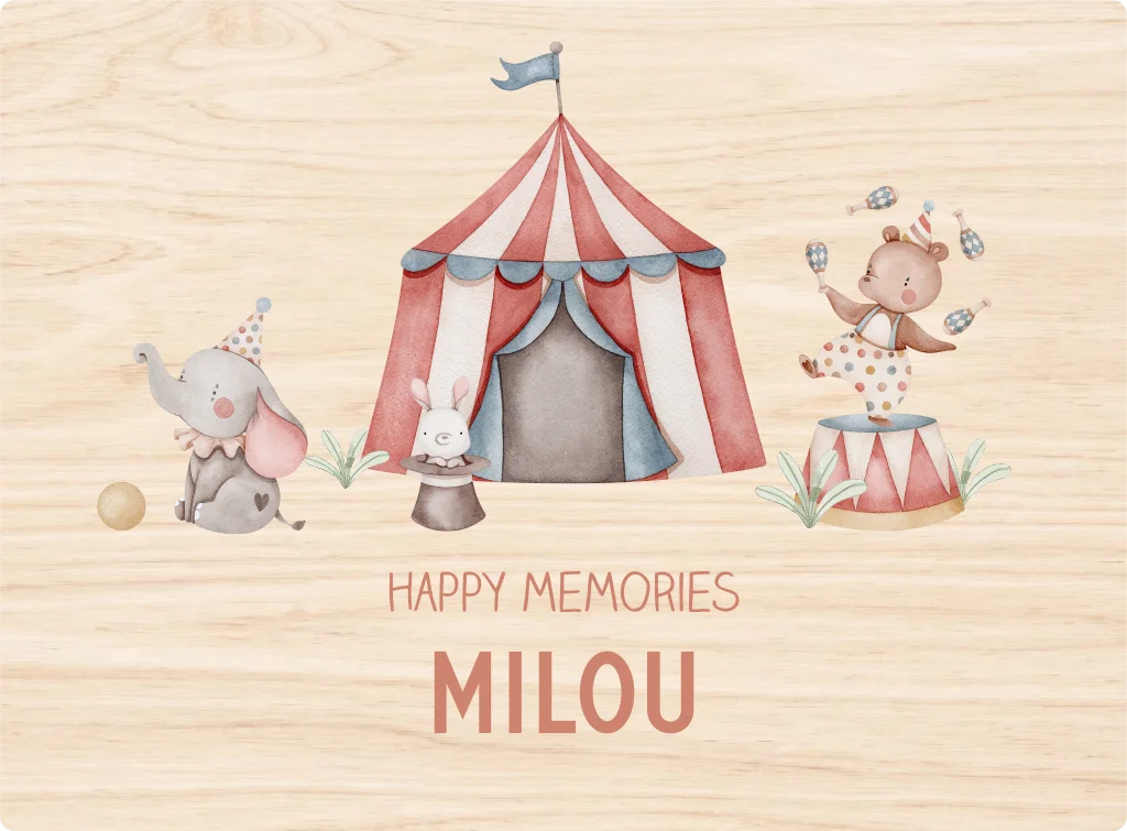 Vrolijke houten memorybox met circus thema en naam