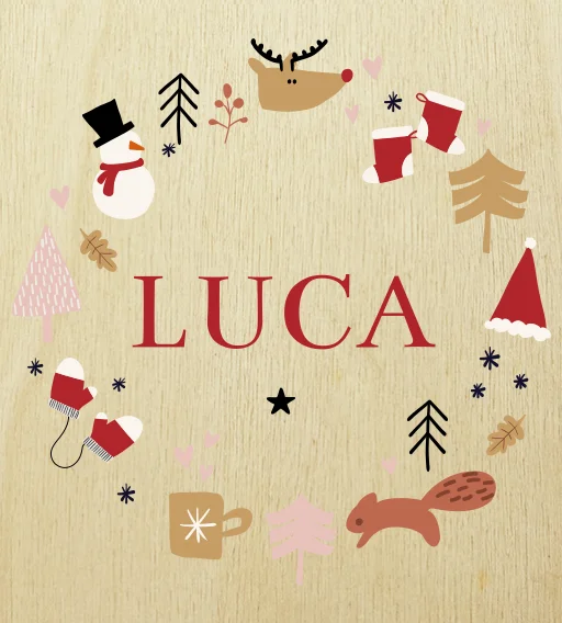 Een houten kersthanger in de vorm van een kerstbal. Op de hanger staat de naam van jouw dierbare. Daar omheen staan vrolijke kerst illustrtaties. Een uniek cadeau voor een dierbare of juf/meester als toevoeging aan de kerstversiering.