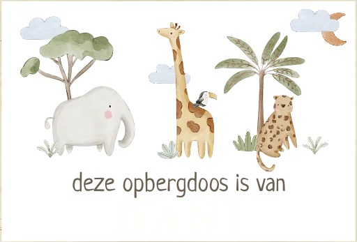 Bewaar de spulletjes van je kleintje in deze mooie opbergdoos. De doos wordt gemaakt van hout. Op de doos zijn een olifant, giraffe en panter te zien. Geef de opbergdoos een persoonlijke touch door de naam van je kleintje erop te zetten.