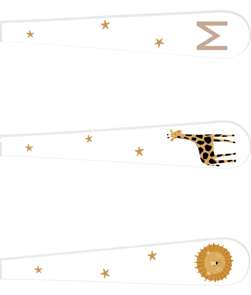 Een schattig kinderbestek voor jouw kleintje. Het bestek heeft een witte basis met daarop illustraties van een leeuwtje en giraffe. Ook zie je het initiaal van de naam van het kindje. Boven de illustraties zie je lieve kleine sterretjes. Het ontwerp kan je naar wens aanpassen.