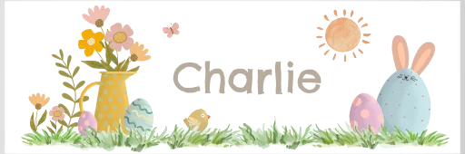 Een vrolijk kinderkommetje voor op de Paas tafel. Het kommetje heeft vrolijke illustraties van verschillende paaseieren in het gras, bloemen en een zonnetje. Daarnaast lees je de naam van het kindje. Pas het ontwerp naar wens aan in onze online opmaaktool.