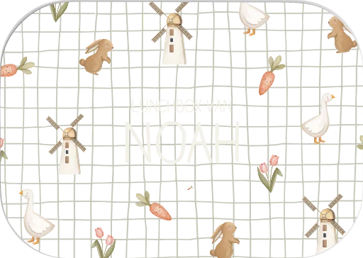 Een toffe broodtrommel voor school en onderweg. De broodtommel heeft lieve illustraties van boerderijdieren, molens en tulpen. Personaliseer de broodtrommel door de naam toe te voegen.