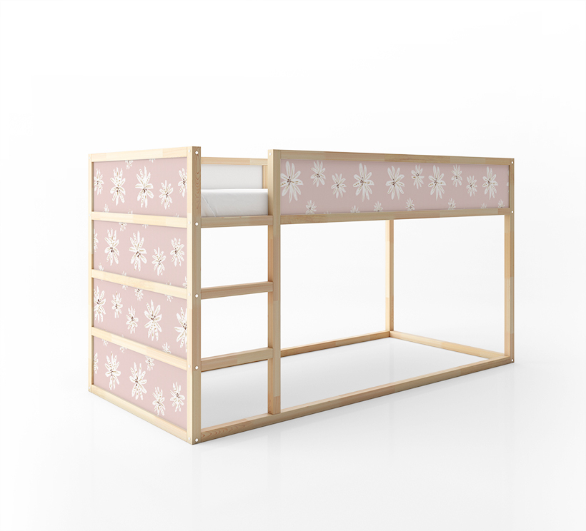 Maak de kinderkamer af met deze sticker voor het Ikea Kura bed. Op de sticker zie je de illustraties van witte bloemen. De sticker kan helemaal naar wens aangepast worden in onze online opmaaktool.