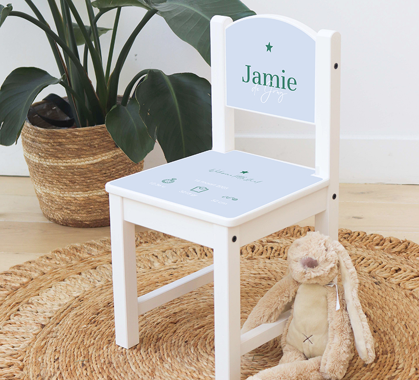 Dit zijn twee vrolijke glanzende stickers die geplakt kunnen worden op het Sundvik kinderstoeltje van Ikea. De stickers hebben een blauwe achtergrond met groene opdruk en de geboortegegevens van jullie kleintje. De linker sticker is voor het zitvlak en de rechter sticker is voor de rugleuning. De stickers zijn helemaal naar wens aan te passen en zijn eenvoudig op het stoeltje te plakken. Het stoeltje wordt niet meegeleverd.