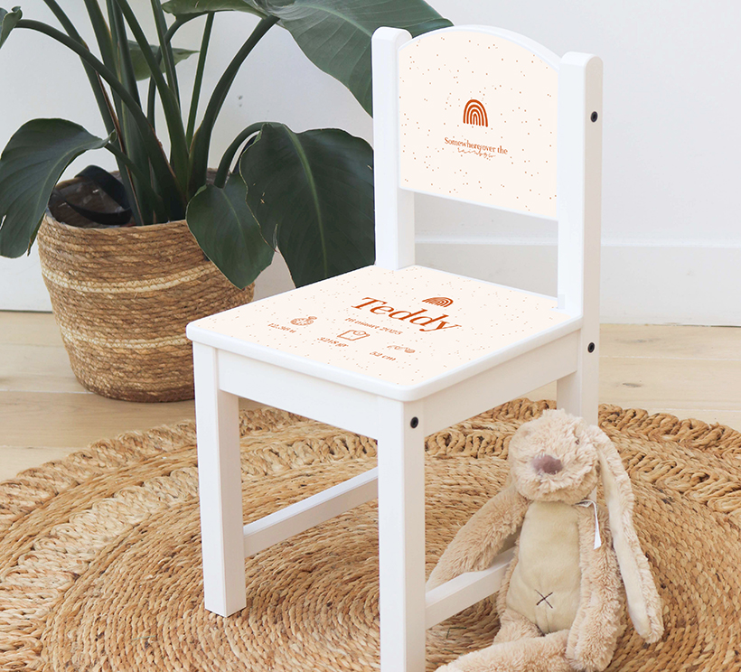 Twee hippe glanzende stickers die geplakt kunnen worden op het Sundvik stoeltje van Ikea. De stickers hebben een lichte achtergrond met roestkleurige stippen. Op de linker sticker, die geplakt kan worden op het zitvlak van het stoeltje, zijn de geboortegegevens van jullie kleintje te zien. Op de rechter sticker, die geplakt kan worden op de rugleuning van het stoeltje, zijn een regenboog en een quote te zien. De stickers zijn helemaal naar wens aan te passen in onze online editor en zijn eenvoudig op het stoeltje te plakken. Het stoeltje wordt niet meegeleverd.