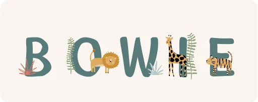 Naamsticker maat medium. De sticker heeft een crèmekleurige achtergrond met een vrolijke illustraties van verschillende jungledieren om de letters van de naam heen.