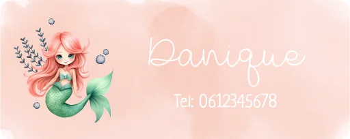 Naamsticker maat medium. De sticker heeft een roze watercolour achtergrond met een illustratie van een zeemeermin in een onder water wereld thema. Naast de zeemeermin is er ruimte voor de naam van het kindje en een telefoonnummer. Pas het ontwerp naar wens aan in onze online editor.