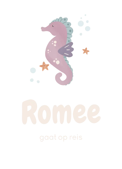 Dit is een schattige trolley om mee te nemen op reis. Op de trolley staat de illustratie van een zeepaardje. De reistrolley kan helemaal naar wens aangepast worden in onze online opmaaktool.