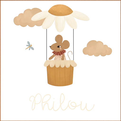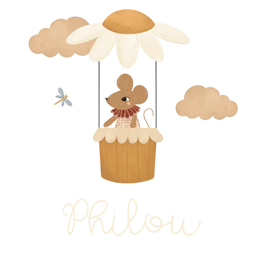 Een vrolijke en hippe reistrolley voor onderweg. De trolley heeft een naam in het midden. Daarnaast zie je een muisje in ee bloemen-luchtballon. Pas het ontwerp naar wens zelf aan.