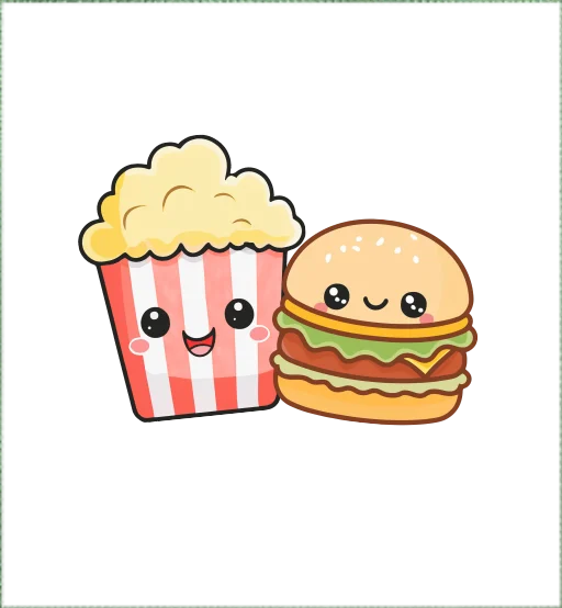 Een vrolijke rugtas met naam. Op de voorzijde zie je de illustraties van een popcorn en hamburger in Kawaii stijl. Onder de illustraties lees je de naam van het kind. Pas het ontwerp naar wens zelf aan.