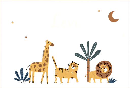 Een vrolijke houten knutseldoos voor alle knutselspullen. Deze kist heeft een toffe illustraties van verschillende jungle dieren onder een sterrenhemel. Boven de dieren lees je de naam van het kind.