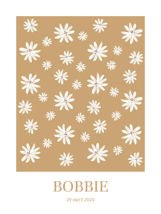 Een trendy canvasposter met stijlvolle bloemenprint. De achtergrond van de poster heeft een okergele kleur. Onder de print kan je de naam en geboortedatum van jouw kindje plaatsen. Pas de poster naar wens aan in onze online editor.
