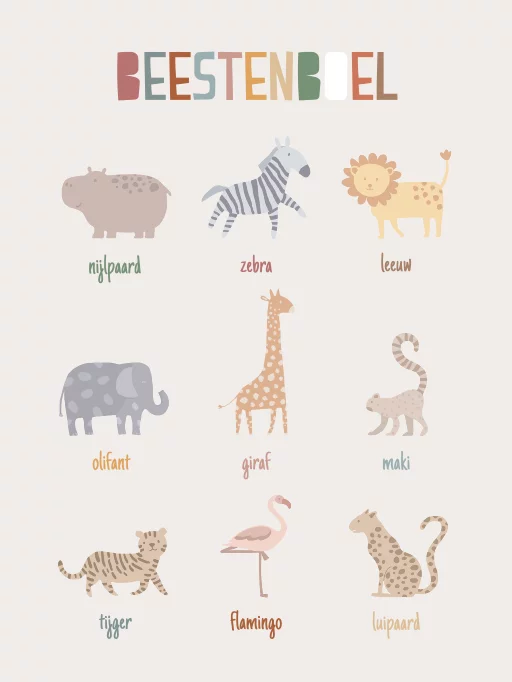Een vrolijke praatplaat voor op de kinderkamer. Op de poster zie je verschillende dieren met daaronder hun naam. Oefen samen met jouw kindje verschillende dierennamen. Bij de poster komen magnetische houten latjes.