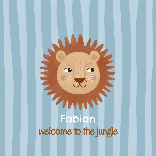 Een avontuurlijke canvasposter met strepenpatroon, leeuwenhoofd en naam. De poster is volledig te personaliseren in onze online editor. Bij deze poster zitten magnetische houten latjes zodat je de poster mooi kan ophangen in de kinderkamer.