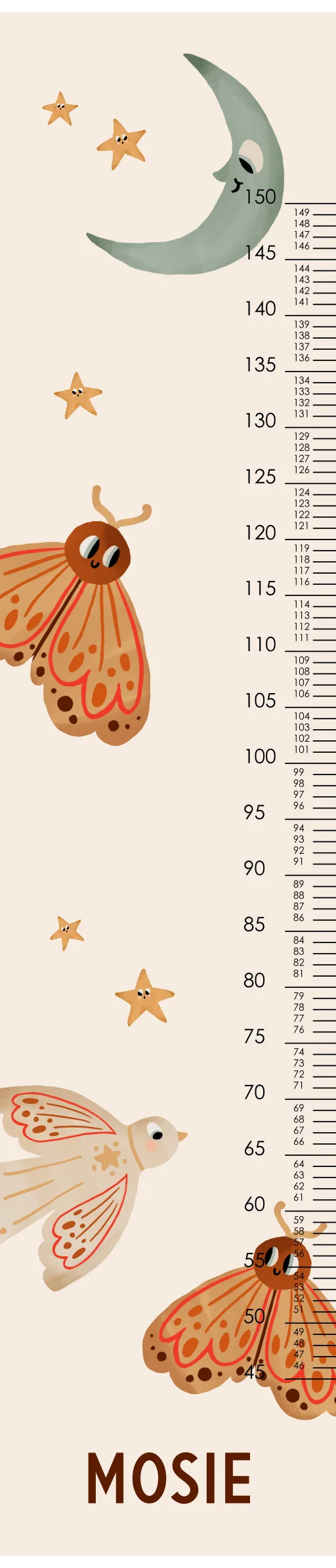Hou de groei van je kleintje bij op een leuke en speelse manier met deze lieve groeimeter! Op de groeimeter zie je diertjes vliegen tussen de sterren en de maan. De achtergrond is beige. De groeimeter is helemaal naar wens aan te passen in onze online editor.