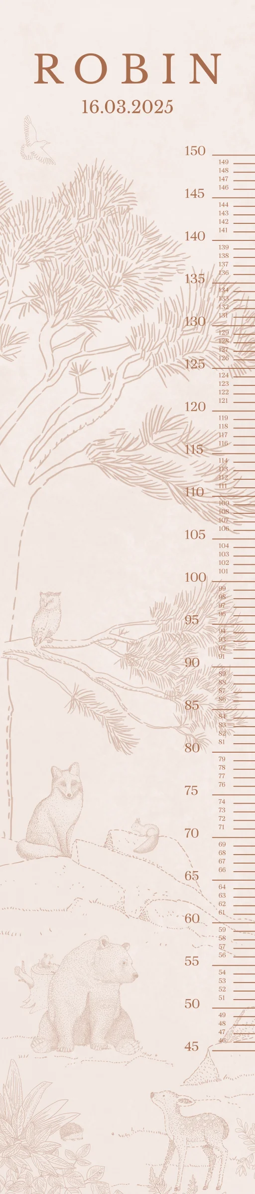 Deze groeimeter is leuk voor de kinderkamer van je eigen kind of om cadeau te doen! Op de groeimeter zijn een uil, vos, eekhoorn, beer en hertje te zien. De bruintinten geven deze groeimeter een rustige uitstraling. De groeimeter is helemaal naar wens aan te passen in onze online editor.