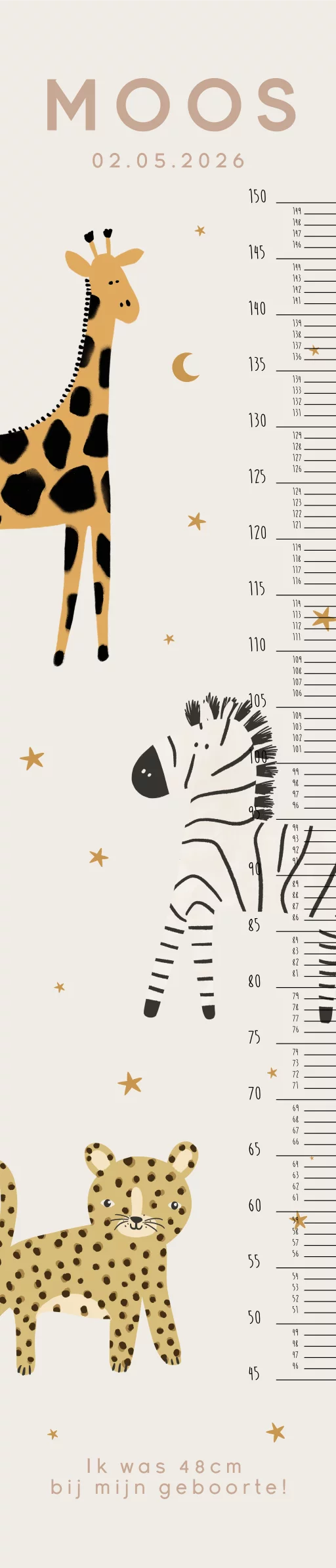 Deze groeimeter is leuk voor de kinderkamer van je eigen kind of om cadeau te doen! Op de groeimeter staan jungledieren zoals een giraf, panter en een zebra. De groeimeter is helemaal naar wens aan te passen in onze online editor.