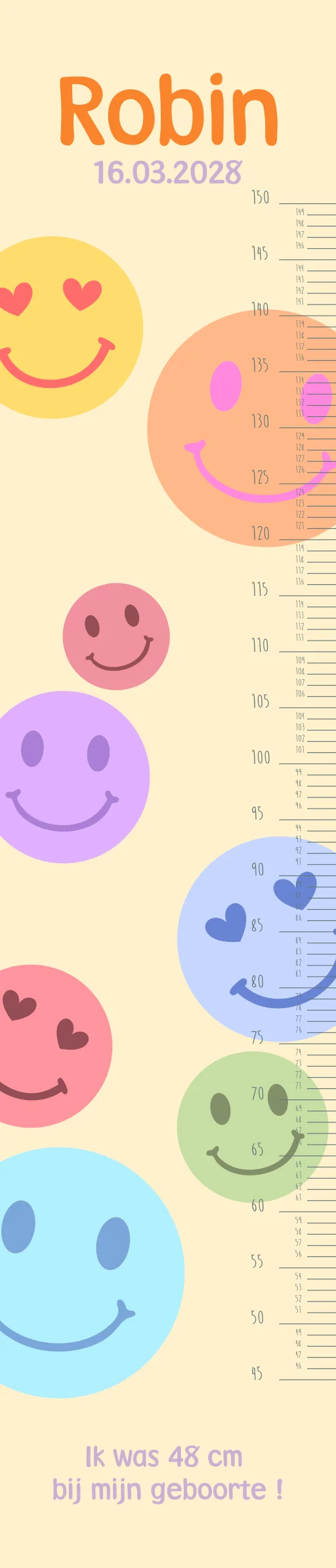 Deze groeimeter is leuk voor de kinderkamer van je eigen kind of om cadeau te doen! Op de groeimeter staan verschillende kleurrijke smileys. De groeimeter is helemaal naar wens aan te passen in onze online editor.