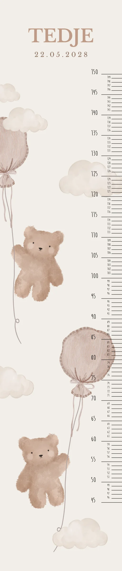 Deze groeimeter is leuk voor de kinderkamer van je eigen kind of om cadeau te doen! Op de groeimeter staan twee lieve teddybeertjes die door de lucht vliegen aan een ballon. De groeimeter is helemaal naar wens aan te passen in onze online editor.