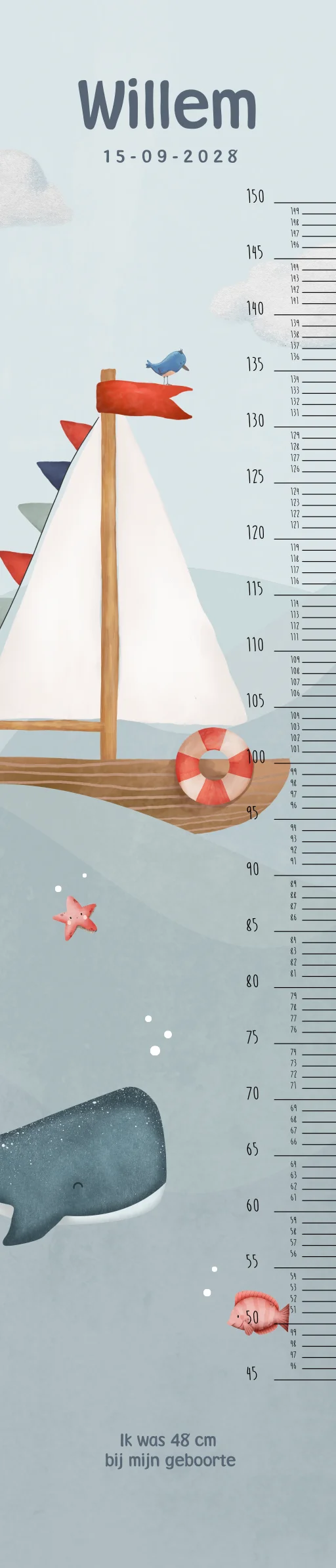 Deze groeimeter is leuk voor de kinderkamer van je eigen kind of om cadeau te doen! Op de groeimeter staat een zeilboot met onder water een walvis, vis en zeester. De groeimeter is helemaal naar wens aan te passen in onze online editor.
