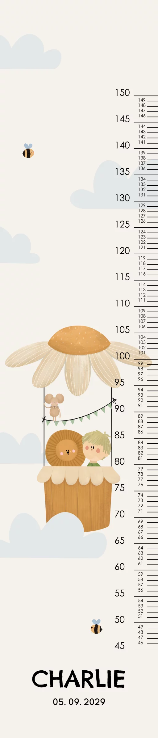 Deze groeimeter is leuk voor de kinderkamer van je eigen kind of om cadeau te doen! Op de groeimeter staat een luchtballon met daarin een jongetje, leeuwtje en een schattig muisje. De achtergond is beige met wat wolkjes. De groeimeter is helemaal naar wens aan te passen in onze online editor. Specificaties groeimeter