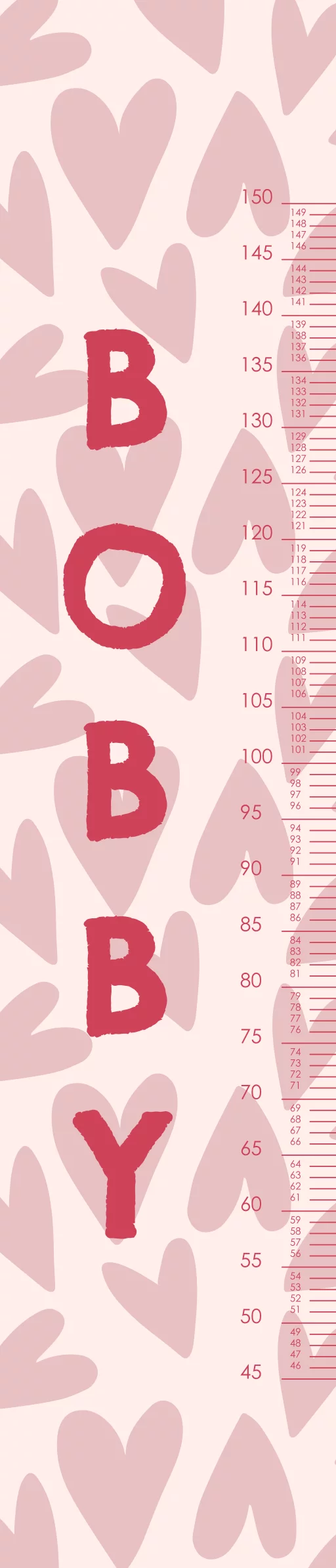 Deze groeimeter is leuk voor de kinderkamer van je eigen kind of om cadeau te doen! De groeimeter heeft een lichtroze achtergrond met daarop roze hartjes. De groeimeter is helemaal naar wens aan te passen in onze online editor. Specificaties groeimeter