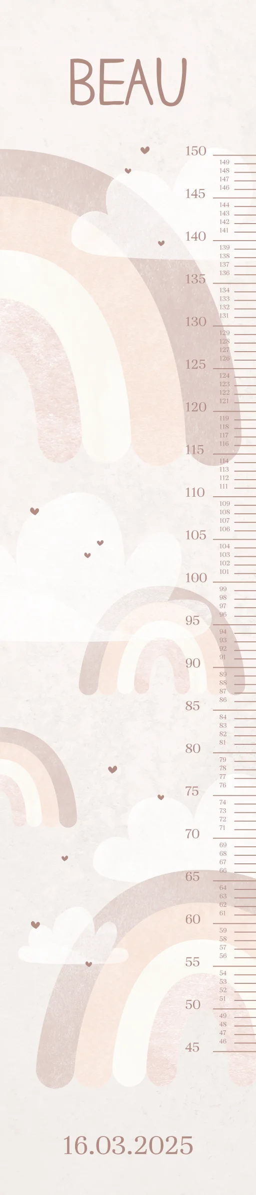 Geef de kinderkamer een persoonlijk tintje met deze groeimeter. De groeimeter heeft een lichtroze achtergrond met illustraties van regenboogjes in roze tinten. De wolkjes en hartjes geven deze groeimeter een speels effect. De groeimeter is naar wens te bewerken in onze online editor.