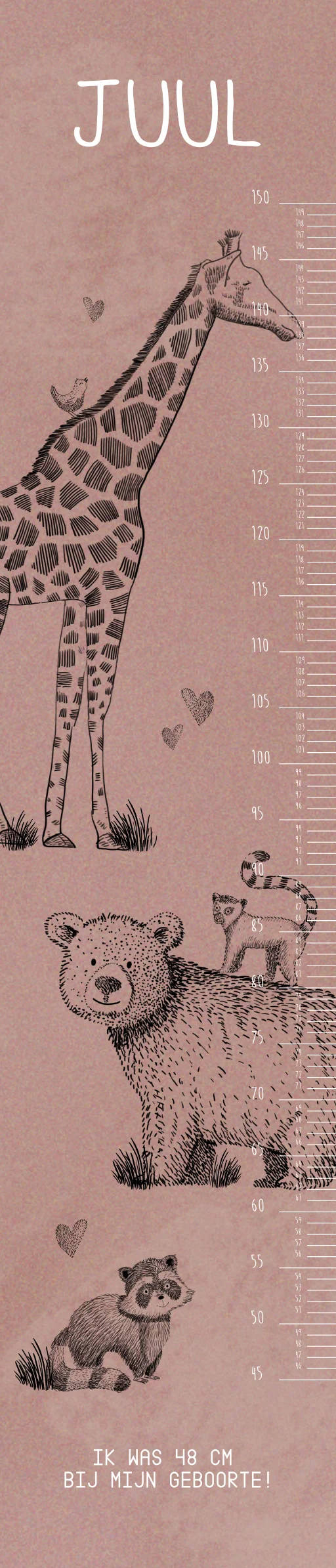 Geef de kinderkamer een persoonlijk tintje met deze groeimeter. De groeimeter heeft een roze velvet-look achtergrond met illustraties van een giraffe, aapje, beer en wasbeer. De hartjes geven deze groeimeter een lieve uitstraling. De groeimeter is naar wens te bewerken in onze online editor.