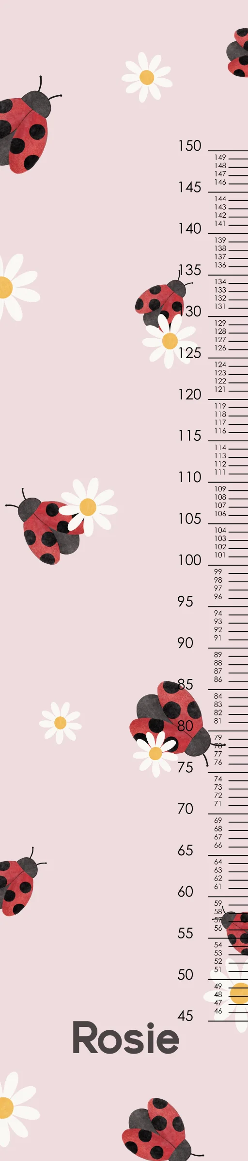 Geef de kinderkamer een persoonlijk tintje met deze groeimeter. De achtergrond is zacht roze met daarop lieveheersbeestjes en bloemetjes. De groeimeter is helemaal naar wens aan te passen in onze online editor. Specificaties groeimeter