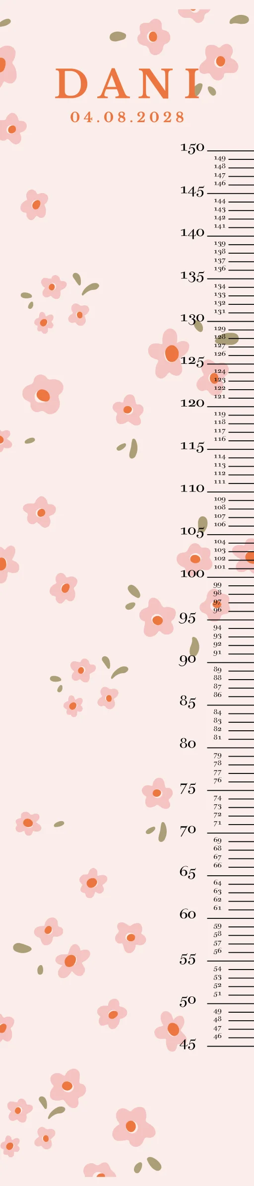 Geef de kinderkamer een persoonlijk tintje met deze groeimeter. De groeimeter heeft een lichtroze achtergrond met daarop roze bloemetjes. De groeimeter is helemaal naar wens aan te passen in onze online editor. Specificaties groeimeter