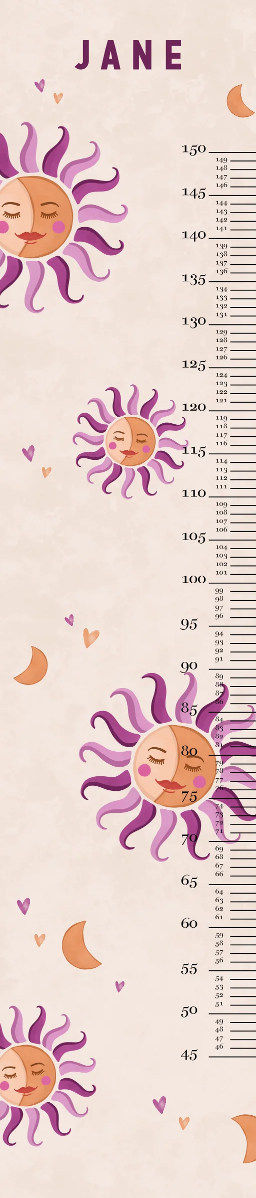 Geef de kinderkamer een persoonlijk tintje met deze groeimeter. De groeimeter heeft een beige achtergrond met daarop kleurrijke zonnetjes en hartjes. Het design is helemaal naar wens aan te passen in onze online editor.