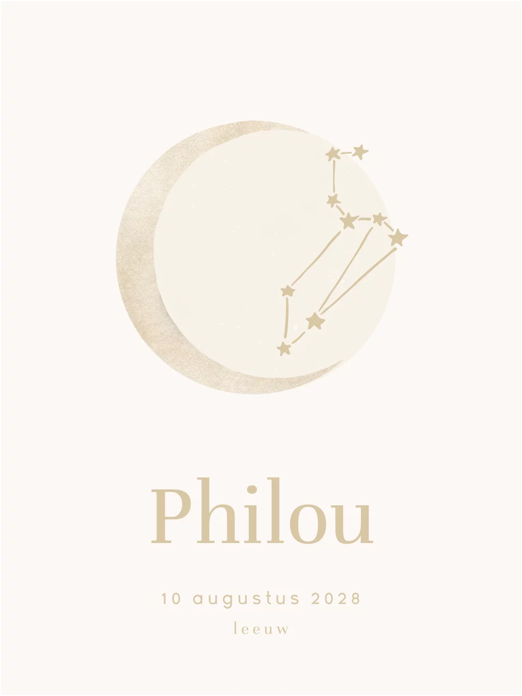 Een mooie poster voor op de baby- of kinderkamertje. Op de poster staat de illustratie van een maan met daarin het sterrenbeeld leeuw. Daaronder kun je zelf heel gemakkelijk de naam en geboortedatum van je kind toevoegen. Dit geeft de poster een persoonlijke touch. In onze online opmaaktool kan het design naar wens aangepast worden.